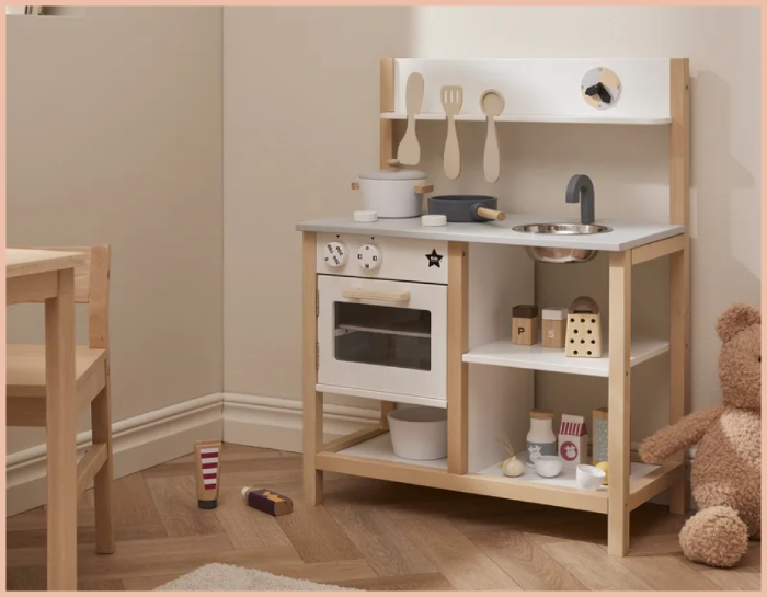 Стилска кујна која е совршена за малиот готвач или пекар. Подгответе ги највкусните јадења во оваа преслатка дрвена кујна. Кујната доаѓа со многу додатоци како што се прилагодливиот часовник, тенџериња и тави, врата на рерната што се отвора, мијалник. Цврстата дрвена кујна во бела боја создава прекрасен простор за игра во детската соба, но ќе изгледа одлично и во дневната соба.