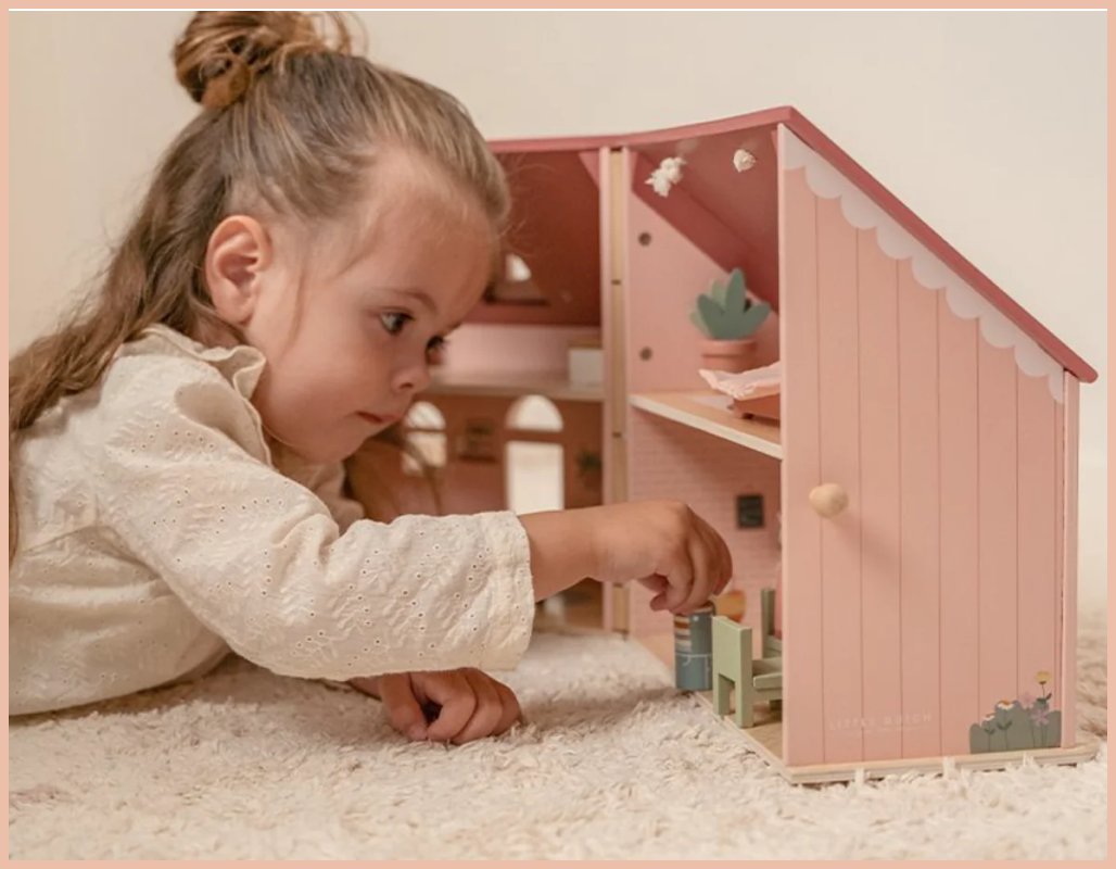 Дрвена преносна кукленска куќичка на Little Dutch е удобно розово скривалиште со прекрасни детали. На долниот спрат се наоѓа дневна соба и кујна, а горе се наоѓаат спалната соба и бања.