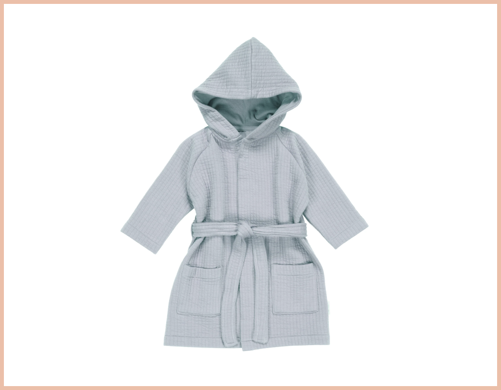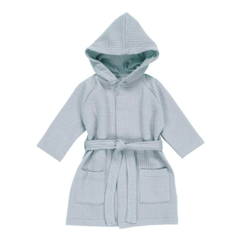 Завиткајте го вашето дете во пријатна топлина по неговото капење со шармантна бањарка со качулка во смирувачката нежно сина боја, изработена од мек памук.