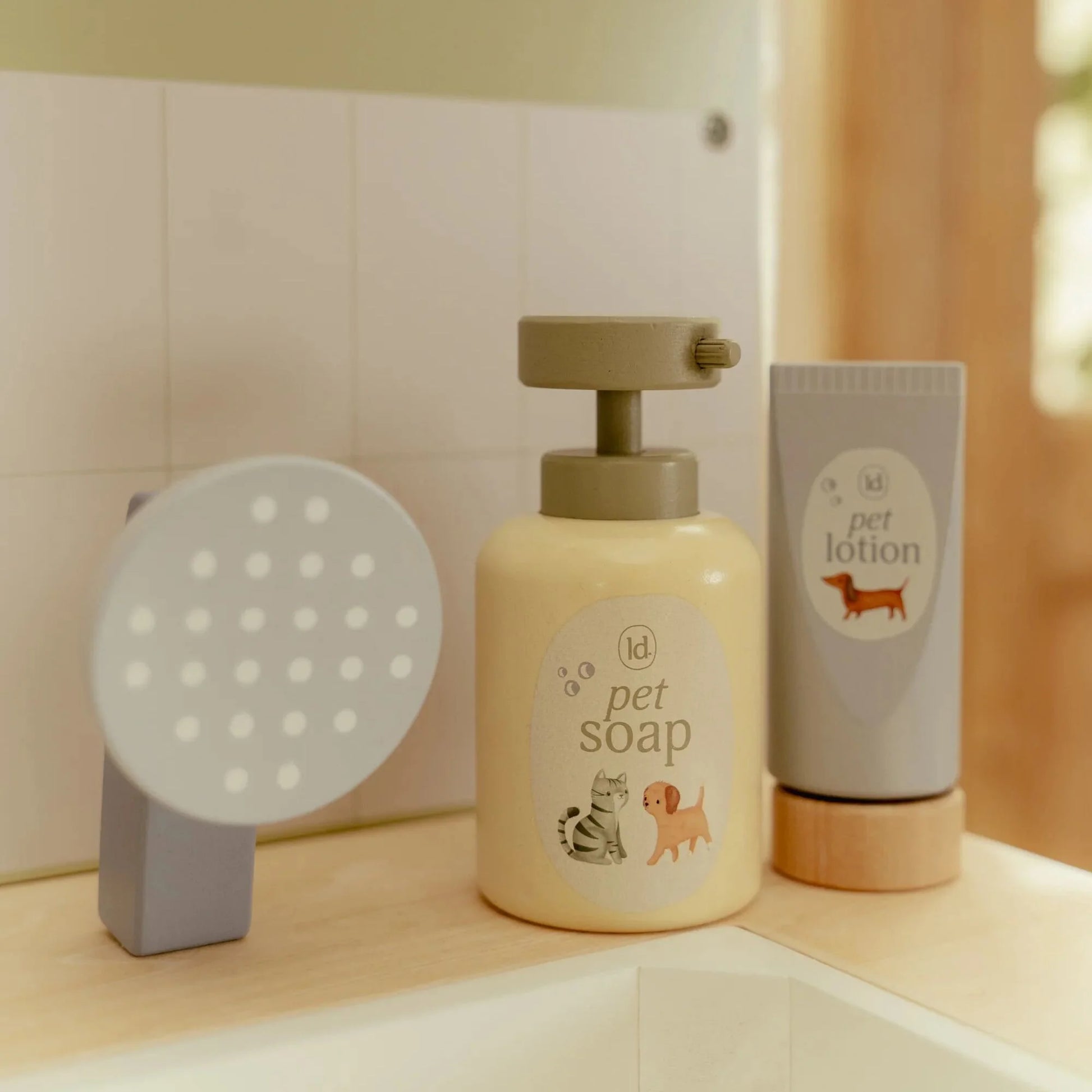 Сетот содржи сè што е потребно за грижа за миленичињата – туш со подвижна цевка и мијалник, чешел, термометар, шприц и фластери. Вклучени се и платнена лента за глава и специјална штипка за закачување медицински илустрации и рендгенски снимки.