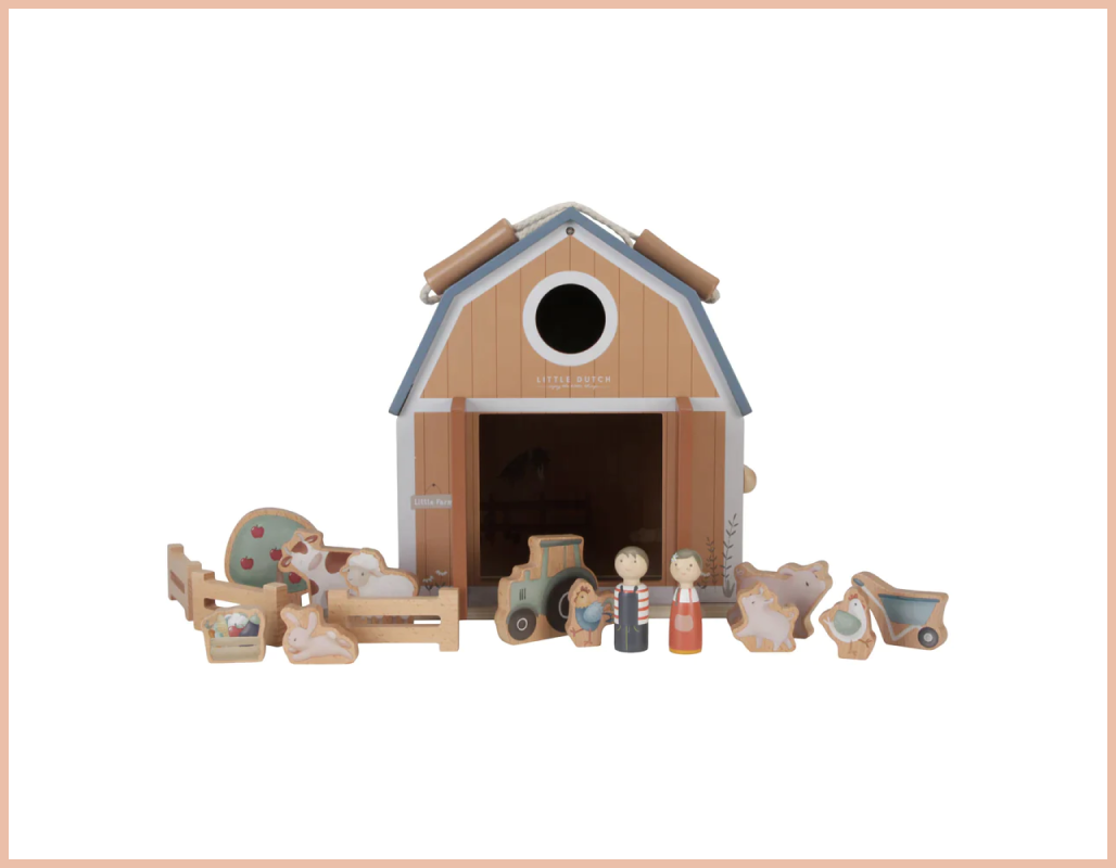 Со оваа преносна дрвена куќа од Little Dutch во форма на штала која стои на фармата, вашето малечко ќе се забавува многу! Отворете ја фармата и животните ќе пристигнат. Со сите овие дрвени фигури за игри, вашето дете може да создаде своја приказна, стимулирајќи го неговото имагинативно размислување. И кога времето за играње ќе заврши, едноставно складирајте ги сите фигури во фармата, преклопете ја вратете ја на назат.