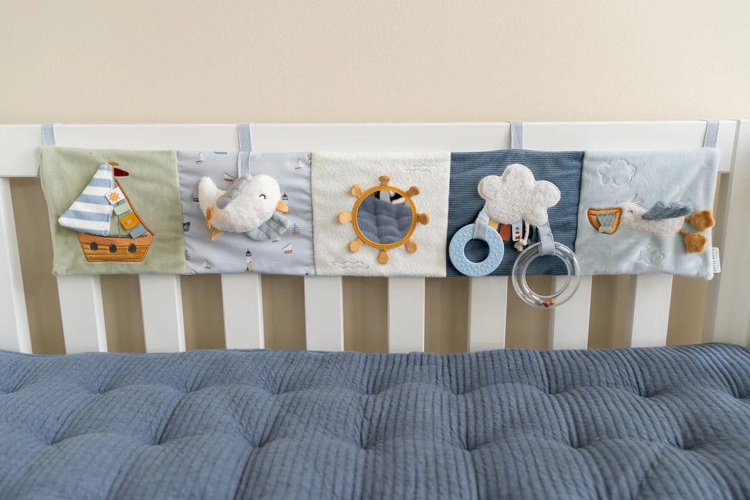 Дозволете му на вашето малечко да истражува со книгата за активности Sailors Bay. Оваа книга за забавни активности ја стимулира координацијата рака-око на вашето бебе. Едноставно прикачете ја над креветчето во вистинската положба. Во првите недели вашето бебе само ќе ја набљудува книгата, но подоцна ќе биде позабавна за играње од лежечка положба.