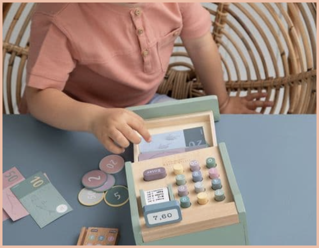 Замислете да имате своја мала продавница. Скенирајте ги производите и притиснете ги малите копчиња за да ја прикажете вкупната сума. Дали сакате да платите во готово или со картичка? Оваа дрвена каса доаѓа со терминал за игла, како и монети и банкноти кои може да се зачуваат во фиоката за готовина. Сè што ви е потребно за да си играте продавница со вашата мајка и тато, пријателите или омилената кукла. Касата, не само што е одлична за глумење игра, туку помага и за развивање на математичките, моторичките и социјалните вештини на вашето дете.