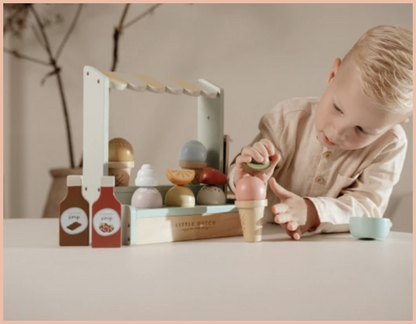 Ова мини продавница за сладолед, со својата симпатична жолто-бела тенда, ве поканува да ги пробате сите шест слатки креации. Можете да наполните било кој од трите корнети и да ја подобрите забавата со различни шарени додатоци. Дозволете му на вашето малечко да ја истражува радоста на водење на сопствена продавница за сладолед изработена од дрво, послужување на имагинарни клиенти или ракување со финансии со вклучениот ценовник. Ова мини продавница за сладолед е дизајнирана за да инспирира повеќечасовна имагинативна игра.