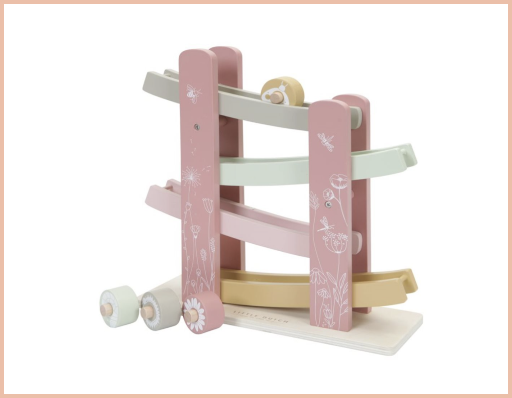 1, 2, 3 и почнете! Сет од цветен дрвен тркач со рампа и 4 украсени тркала, вашето малечко ќе се забавува одлично. Ставете ги бубачките, гасеницата, полжавот и цветот еден по еден на врвот на патека, пуштете ги и тие ќе се тркаат надолу.